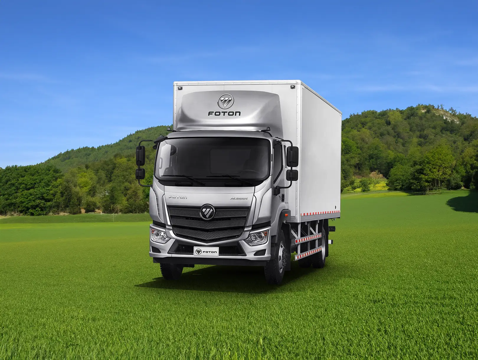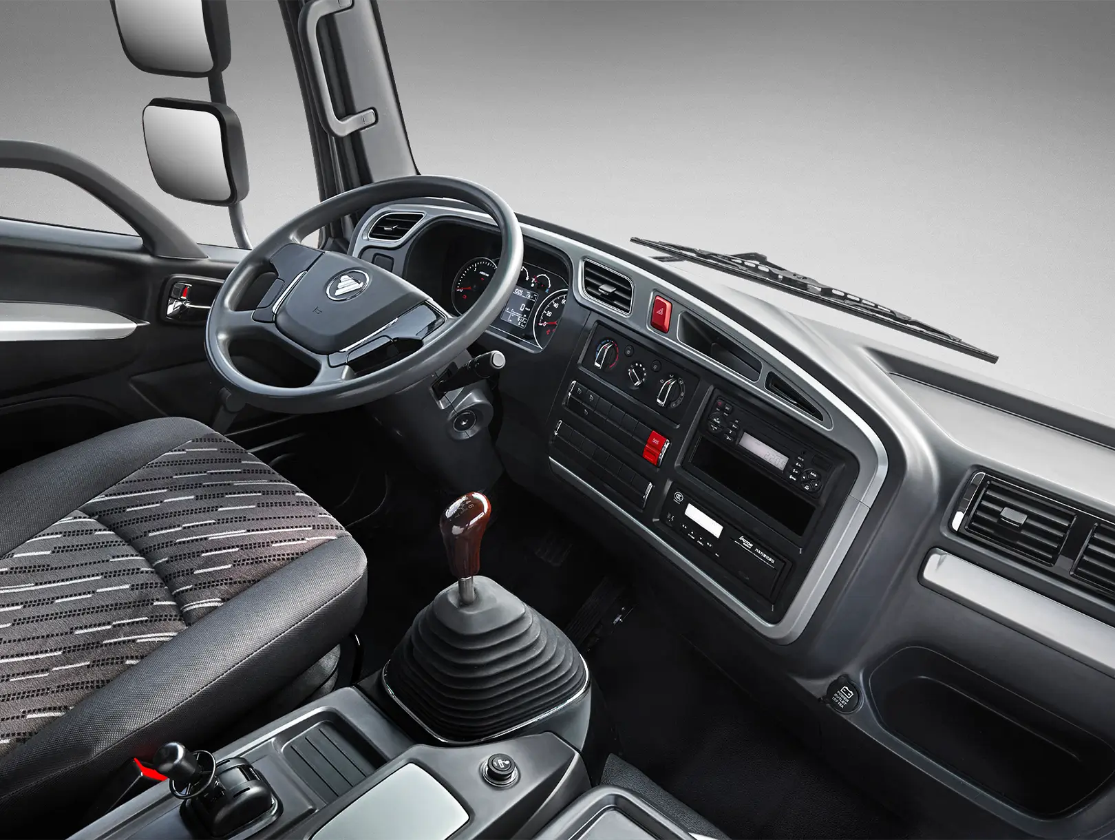 Cabina moderna con parrilla cromada, faros de alta intensidad y deflector de aire que reduce resistencia. Su estructura semiflotante y volante ajustable ofrecen comodidad sin perder presencia industrial.