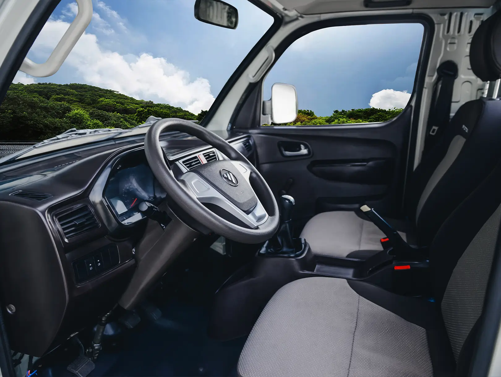 Panel de instrumentos básico con indicadores esenciales, dirección asistida (si disponible en la versión local), controles eléctricos opcionales, arquitectura simple para facilitar mantenimiento.